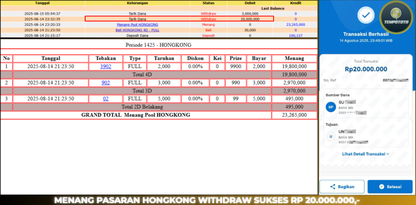TEMPOTOTO MENANG JP BESARĀ yang diberikan kepada semua orang ada bentuk nyata bahwa setiap game yang dimenangkan disitus terpercaya Tempototo adalah real. Kami ucapkan selamat kepada member yang berhasil menang di togel HONGKONGĀ sebesar Rp.20.000.000.-