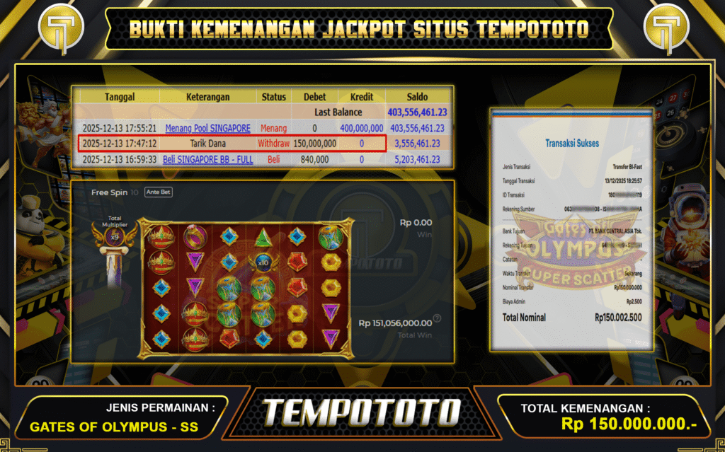 HOKI 150JT DARI TEMPOTOTO – Tempototo menjamin semua kemenangan Anda nyata. Inilah bukti kami sebagai situs terpercaya. Kami ucapkan selamat kepada member ID : WAW*** yang berhasil menang di slot GATES OF OLYMPUS SUPER SCATTER sebesar Rp.150.000.000.-Tempototo terbukti membayar semua kemenangan member secara lunas dan tanpa ribet. Ini saatnya, jika anda mencari situs terpercaya ada baiknya anda mencoba situs Tempototo. Situs yang memberikan kenyamanan dan kepercayaan terhadap pembayaran setiap withdraw yang di lakukan oleh ribuan member.