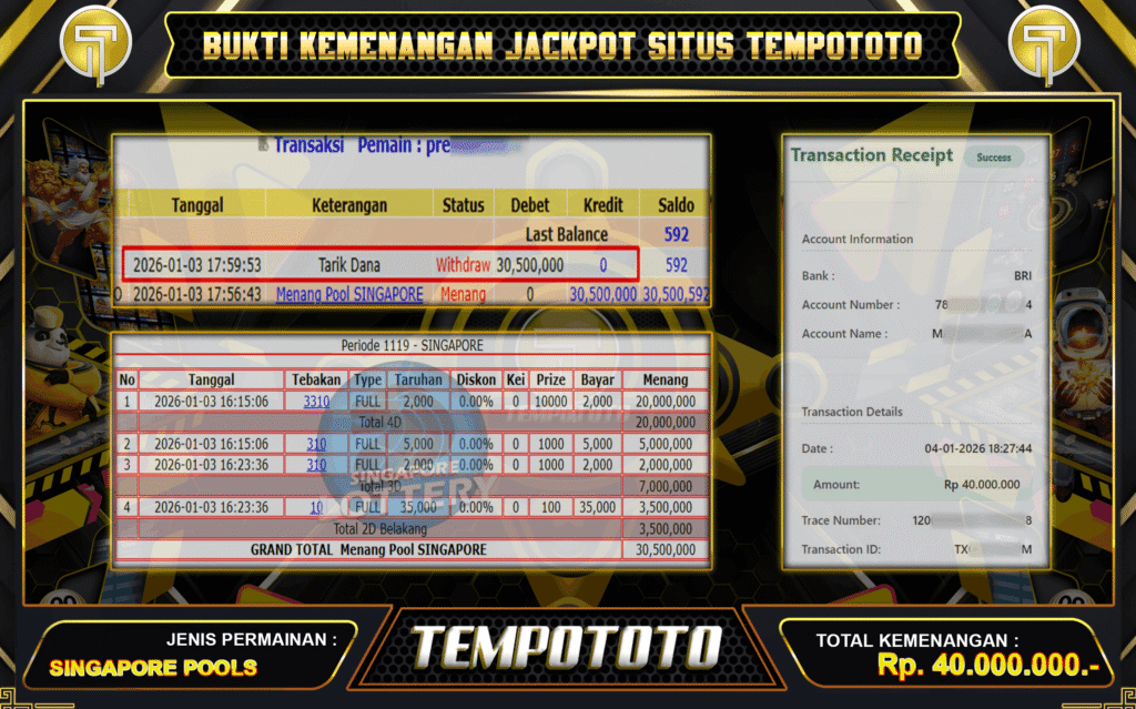 TOGEL SINGAPORE TEMBUS 40JT – Tempototo menjamin semua kemenangan Anda nyata. Inilah bukti kami sebagai situs terpercaya. Kami ucapkan selamat kepada member ID : PRE***** yang berhasil menang di pasaran togel SINGAPORE sebesar Rp40.000.000.-Tempototo terbukti membayar semua kemenangan member secara lunas dan tanpa ribet. Ini saatnya, jika anda mencari situs terpercaya ada baiknya anda mencoba situs Tempototo. Situs yang memberikan kenyamanan dan kepercayaan terhadap pembayaran setiap withdraw yang di lakukan oleh ribuan member.