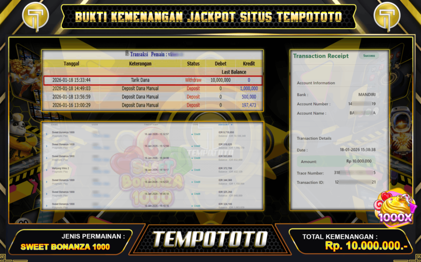 MAXWIN SPEKTAKULER TEMPOTOTO – menjamin semua kemenangan Anda nyata. Inilah bukti kami sebagai situs terpercaya. Kami ucapkan selamat kepada member ID : vi****z yang berhasil menang di permainan slot SWET BONANZA 1000 sebesar Rp 10.000.000.-Tempototo terbukti membayar semua kemenangan member secara lunas dan tanpa ribet. Ini saatnya, jika anda mencari situs terpercaya ada baiknya anda mencoba situs Tempototo. Situs yang memberikan kenyamanan dan kepercayaan terhadap pembayaran setiap withdraw yang di lakukan oleh ribuan member.